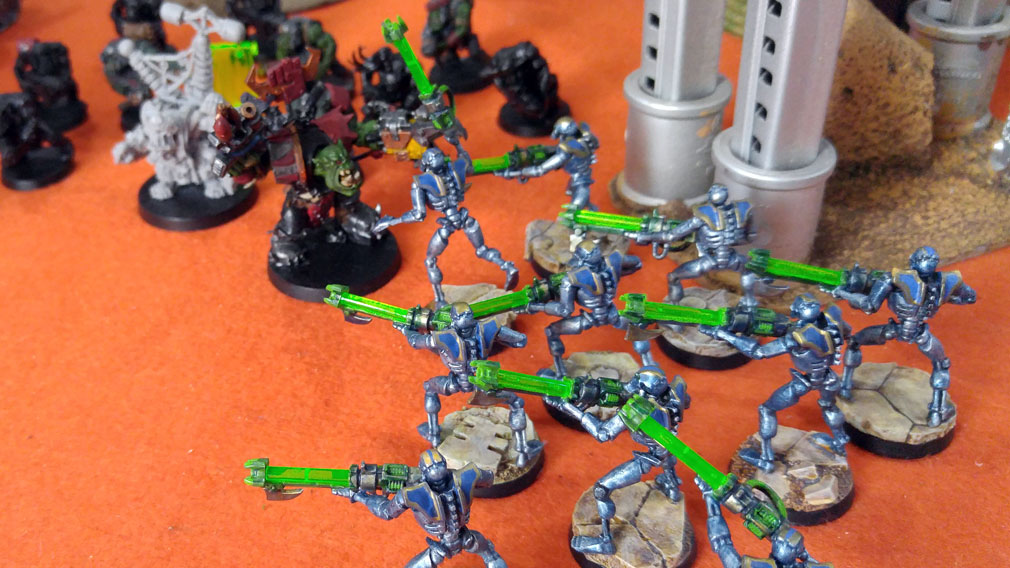 Todos os Orks atingiram suas marcas, exatamente como eu havia planejado. O esquadrão do Warboss iria dizimar os meus Warriors e consolidar em minha direção ao mesmo tempo que eu dizimaria os Boys com minha corte real e consolidaria na direção oposta: Anarkyr provia counter-attack e eu tinha três Warscythes no esquadrão, além dos imortais e do Cryptek. Uma orbe de ressureição garantia que eu poderia facilmente reduzir minhas perdas e fazer a contra-investida no turno seguinte.