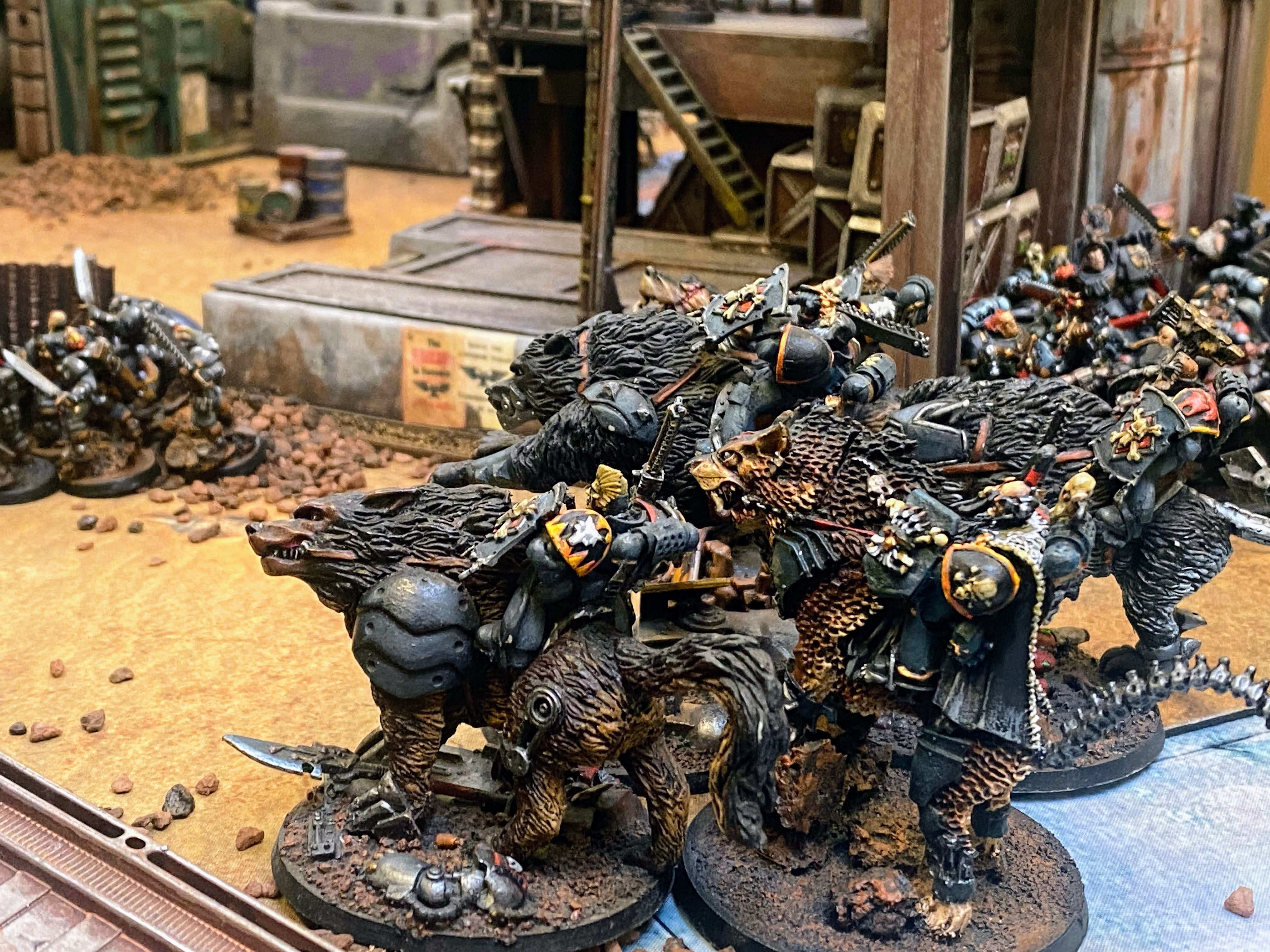 First, da humie infiltrators crept forward, tryin' to be all sneaky-like. But dem Space Wolves, all brutish apes ridin' giant wolf-like beasts, pounced on 'em! Oh, it was a right spectacle, blood sprayin' everywhere, bodies flyin'. Gave me a good laugh, I tell ya!